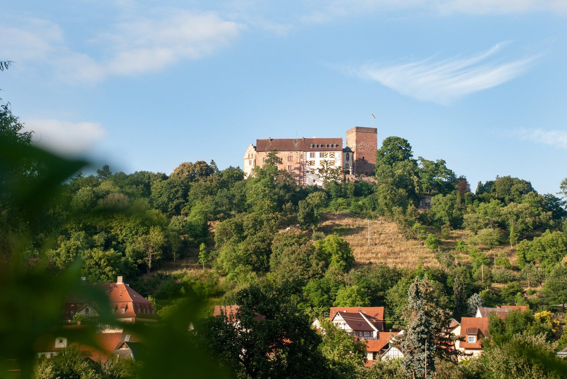 Genießen Sie aus allen Zimmern, den Ferienwohnungen, dem Frühstücksraum und dem Garten einen freien Blick auf die Burg "Gamburg".